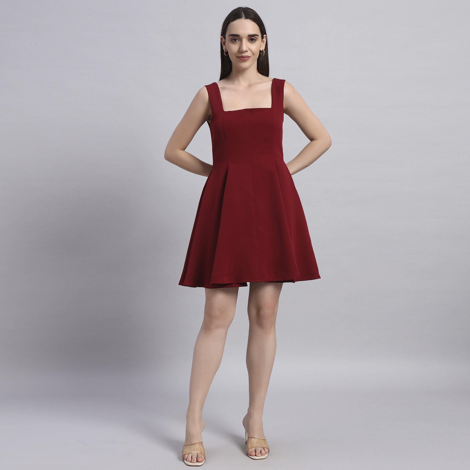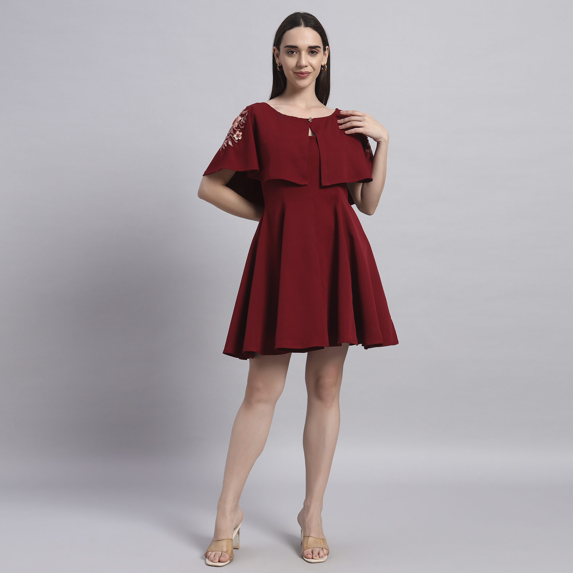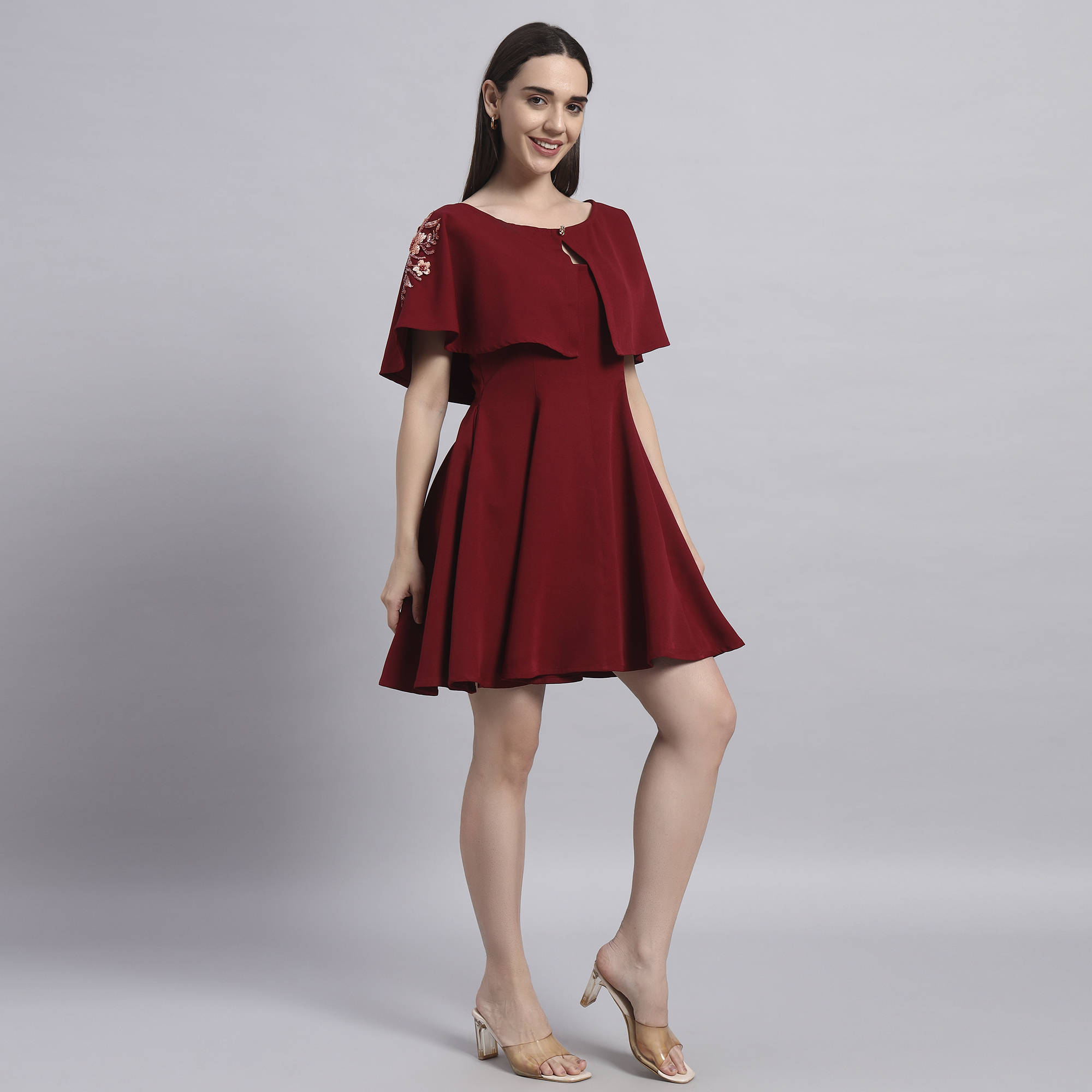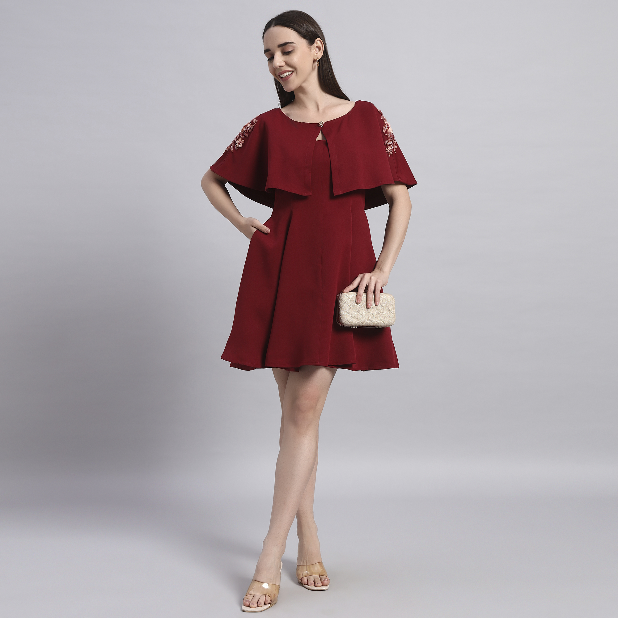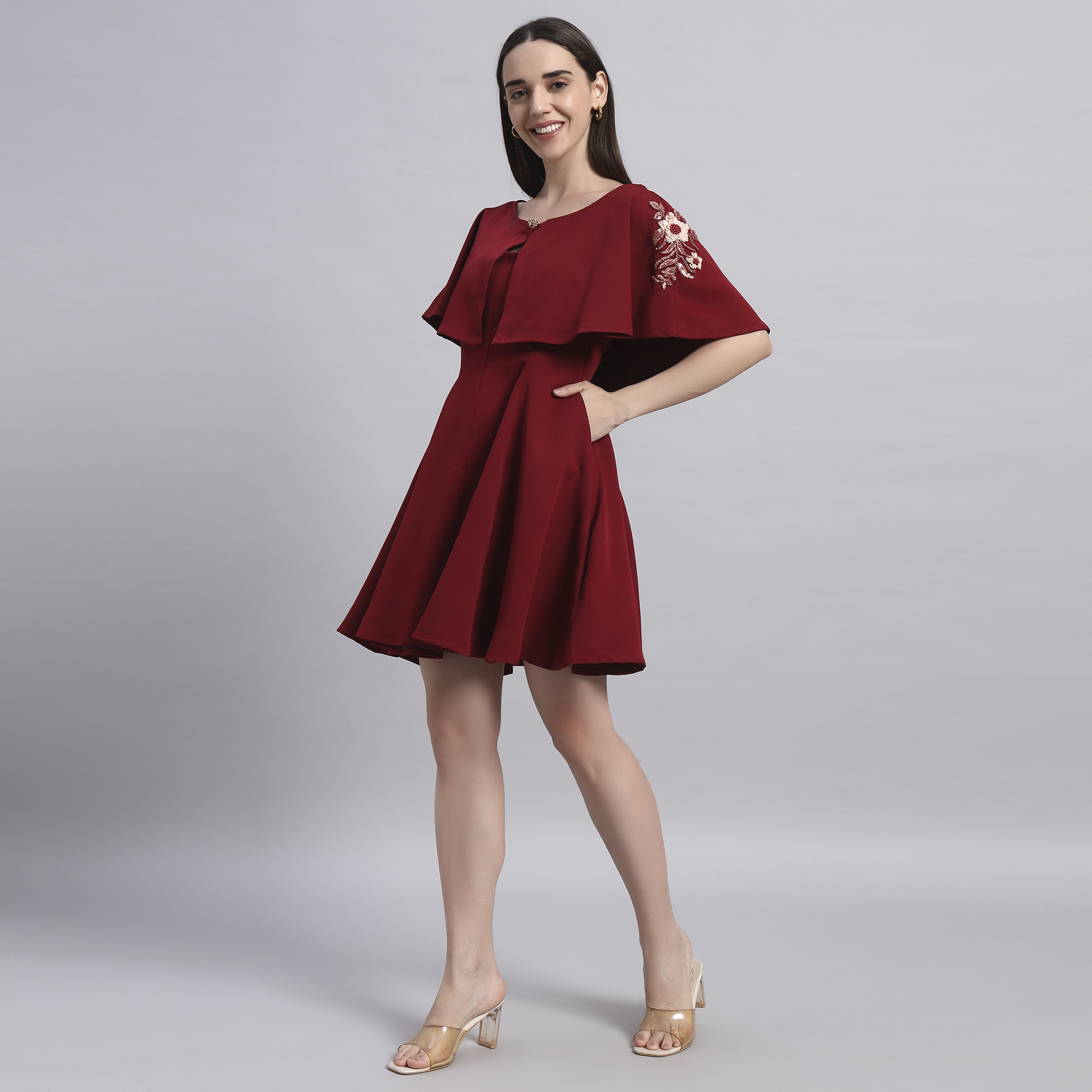 Turn heads effortlessly with this elegant maroon cape dress set — a perfect blend of modern silhouette and Indian-inspired charm. Crafted in soft polyester fabric, this ensemble offers both comfort and style for your festive yet smart occasions. The embroidered cape adds a touch of festive sparkle and can be paired with other outfits too, making it a versatile addition to your wardrobe. The fit-and-flare dress comes with practical side pockets and a flattering flare that makes it your go-to outfit for weddings, office parties, or contemporary festive gatherings.