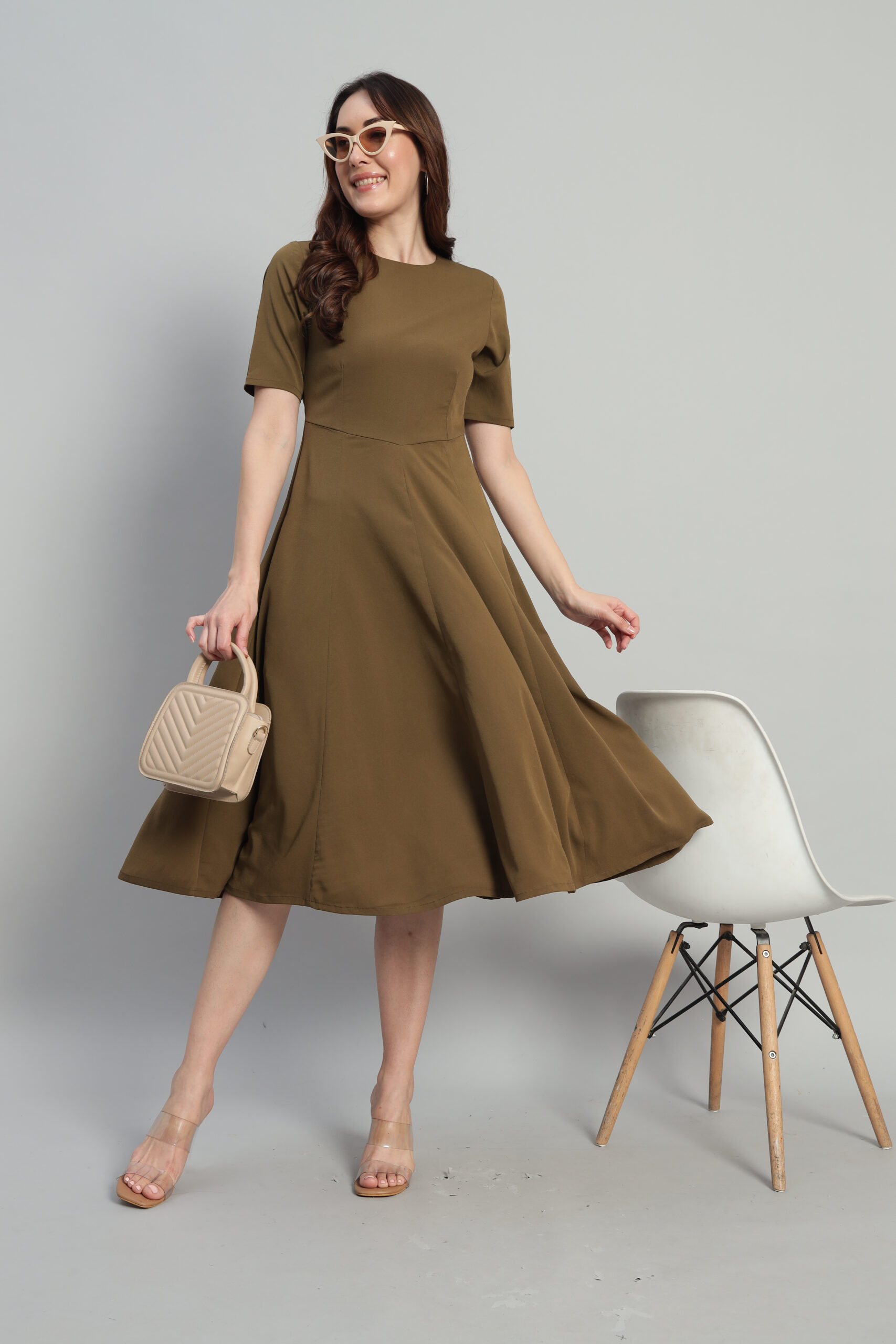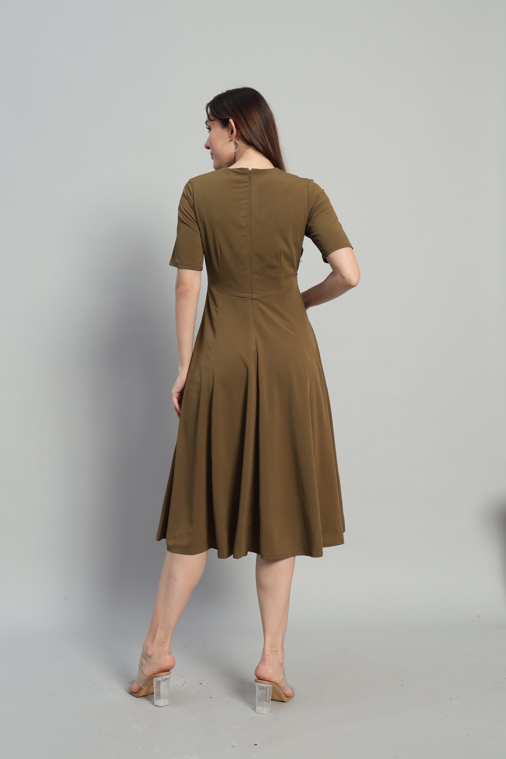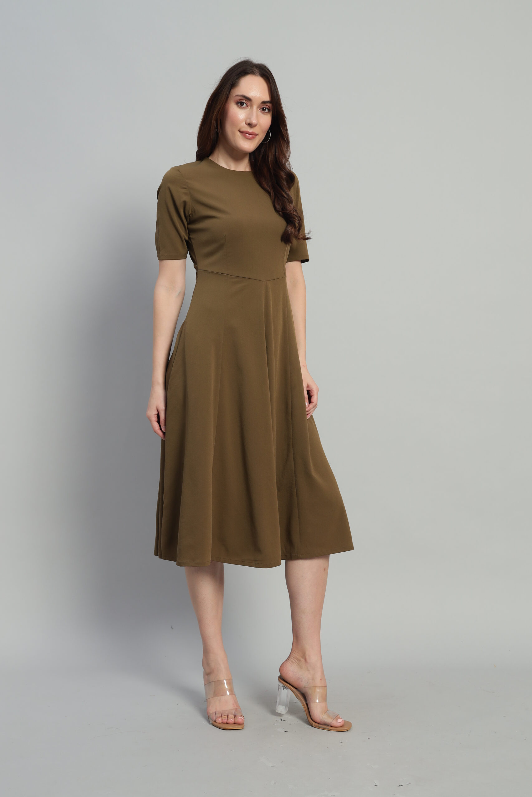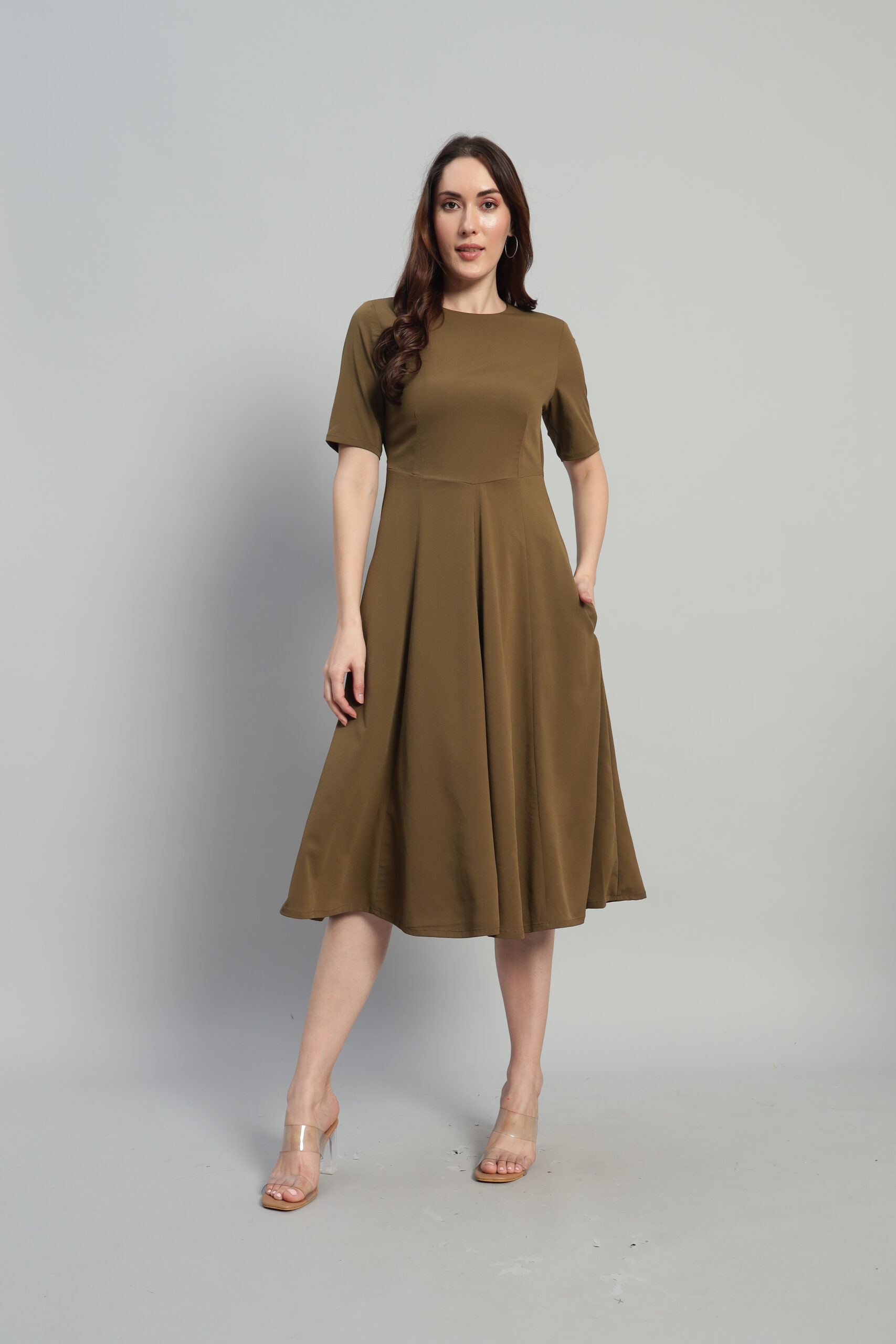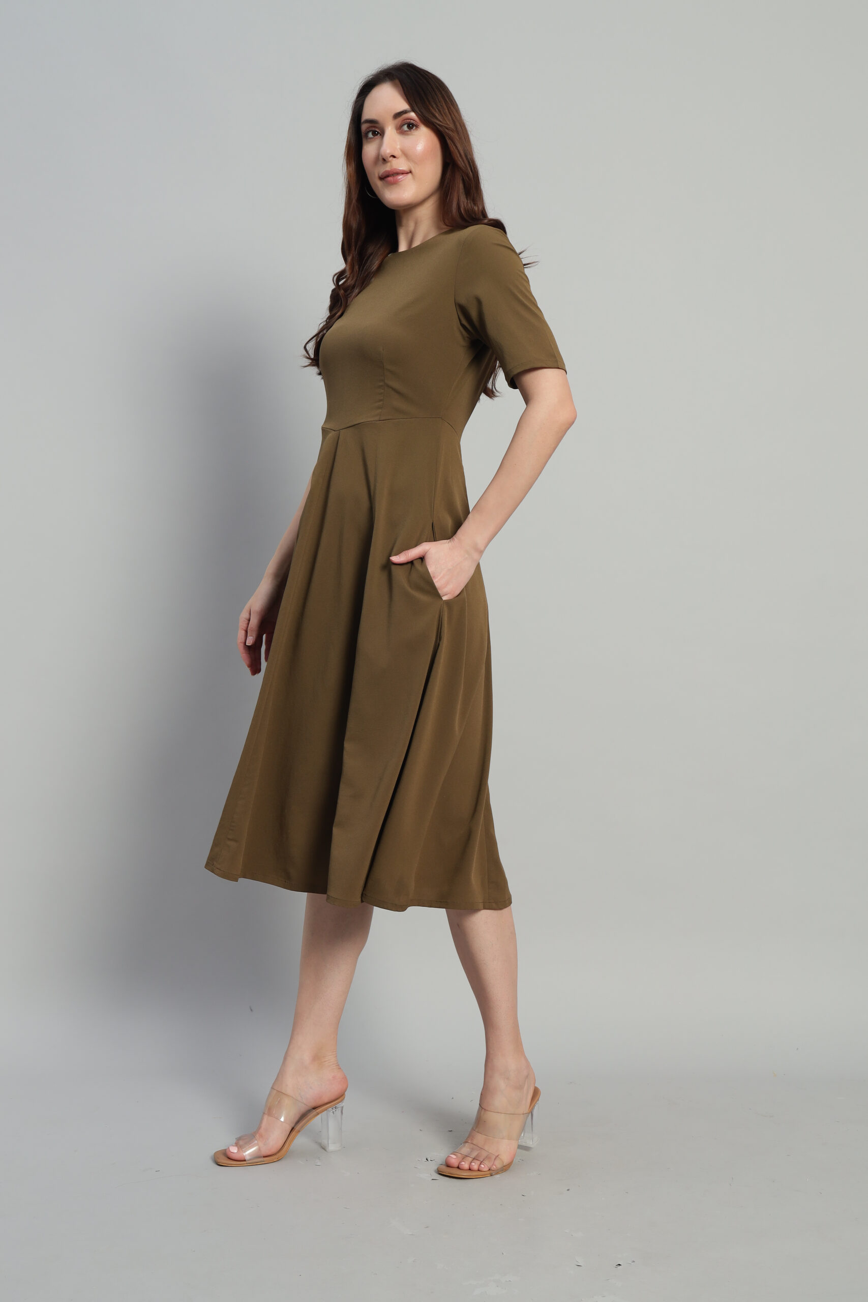 Elevate your style with Arty Chic’s effortlessly green midi dress. Designed with a refined styleline waist and flowing panels below, it creates a flattering, feminine silhouette. The calf-length hem, elbow-length sleeves, and functional side pockets make it as practical as it is elegant. A discreet back zipper ensures a seamless fit, making this dress a versatile choice for both daytime outings and evening events.