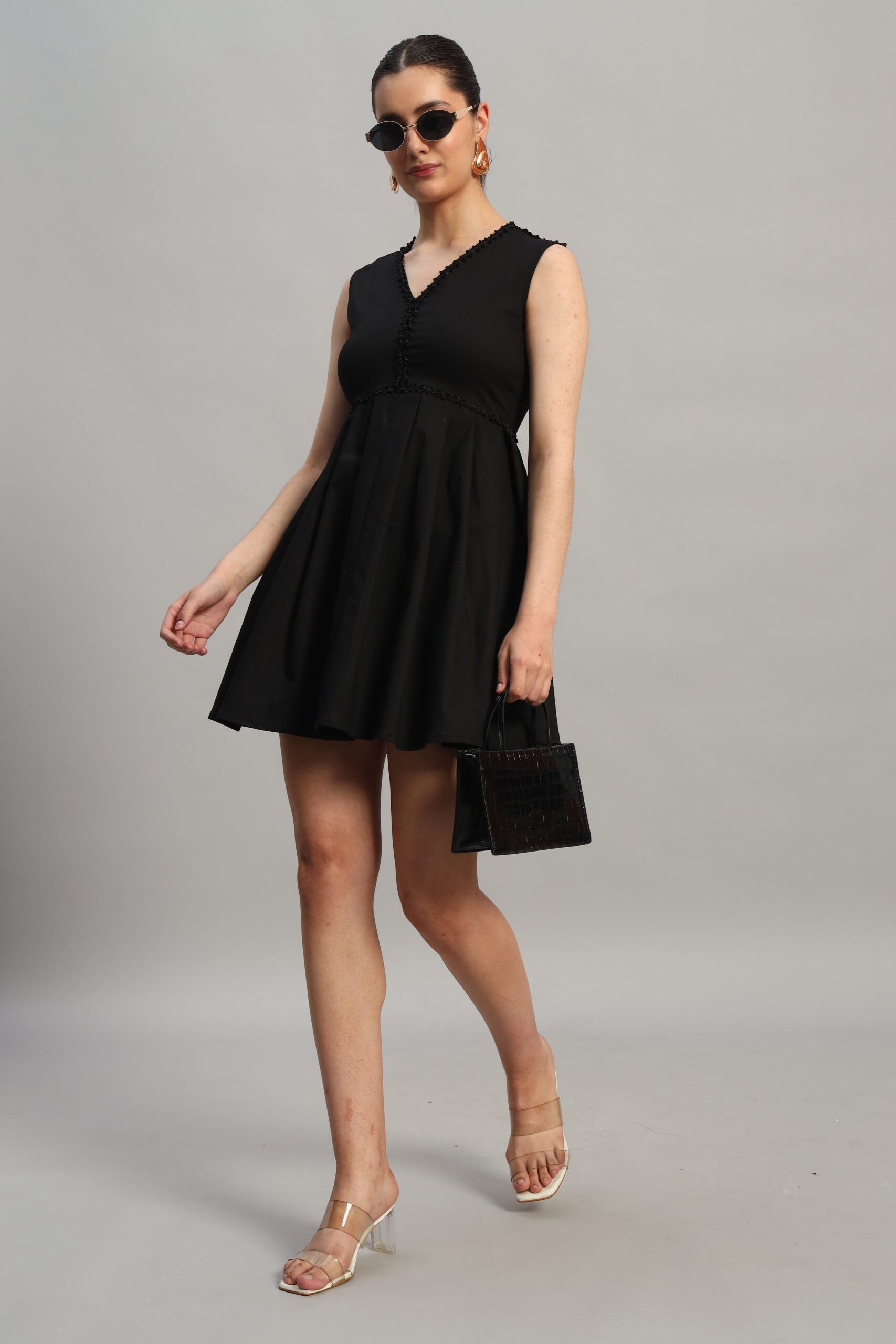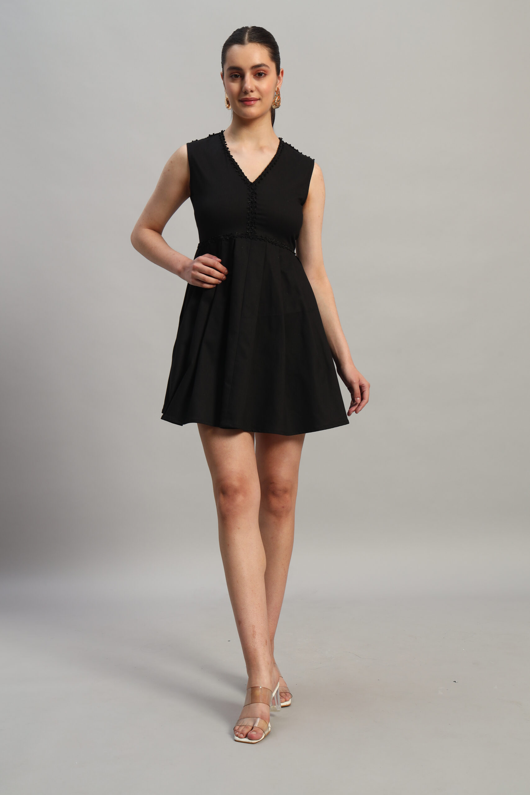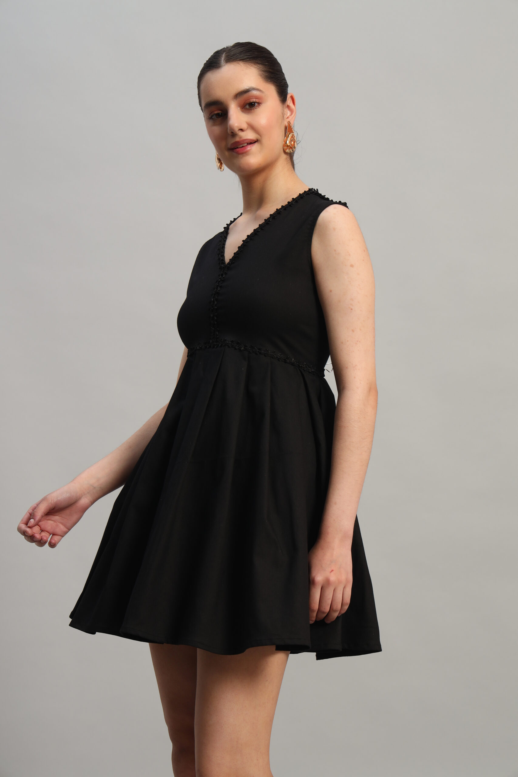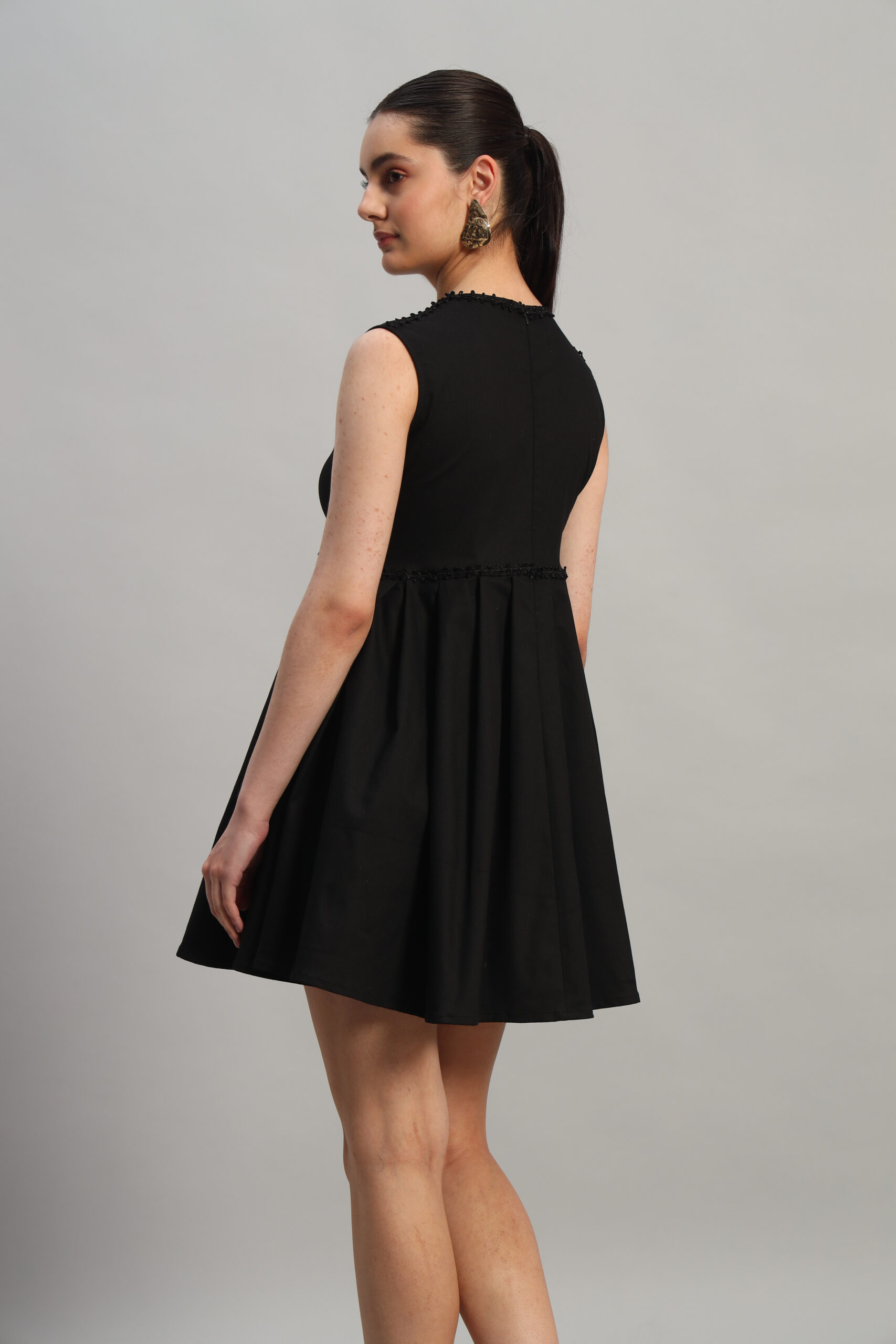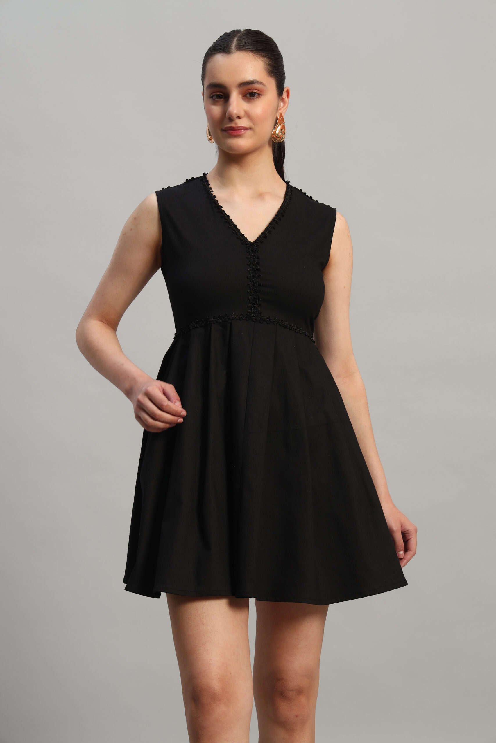 Effortlessly elegant, Arty Chic’s black sleeveless dress is the perfect blend of sophistication and charm. Featuring a flattering pleated waist design and a delicate lace detail running across the waistline, it accentuates your silhouette beautifully. The above-knee length adds a touch of playfulness, while the back zipper ensures a sleek and secure fit.