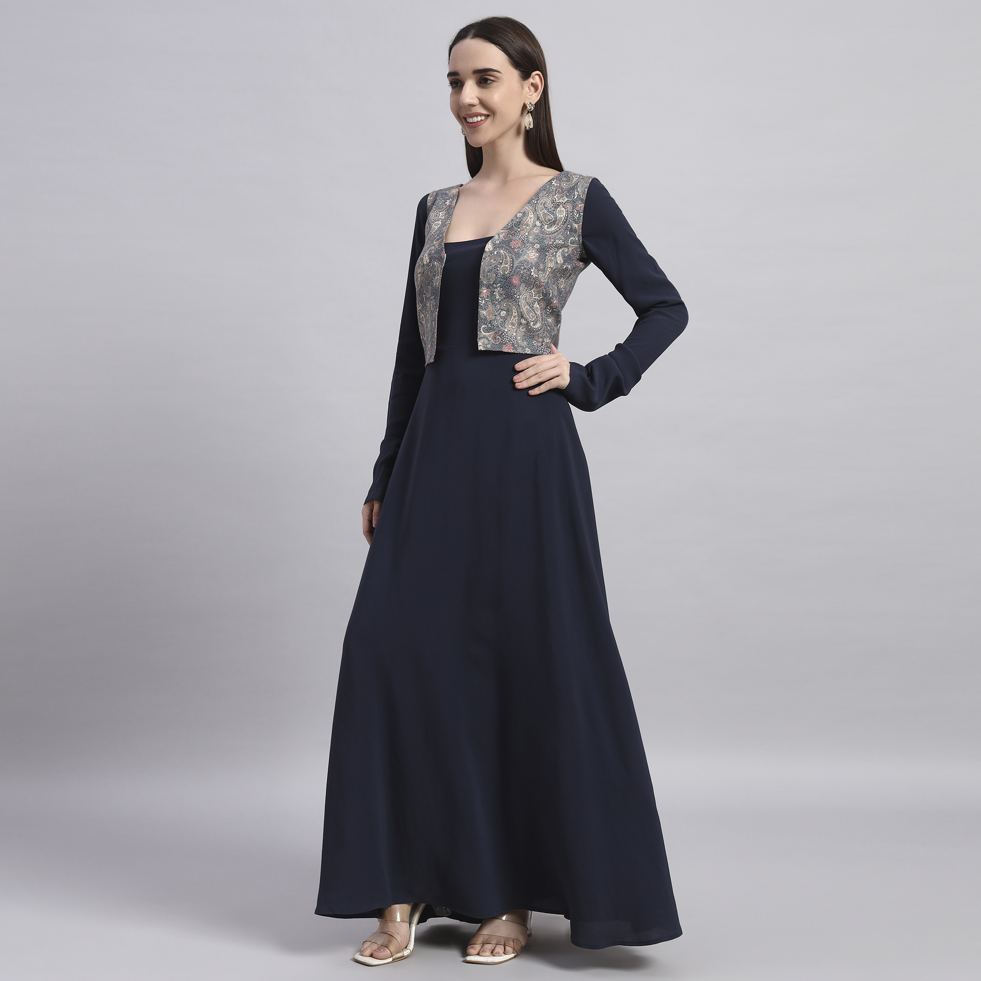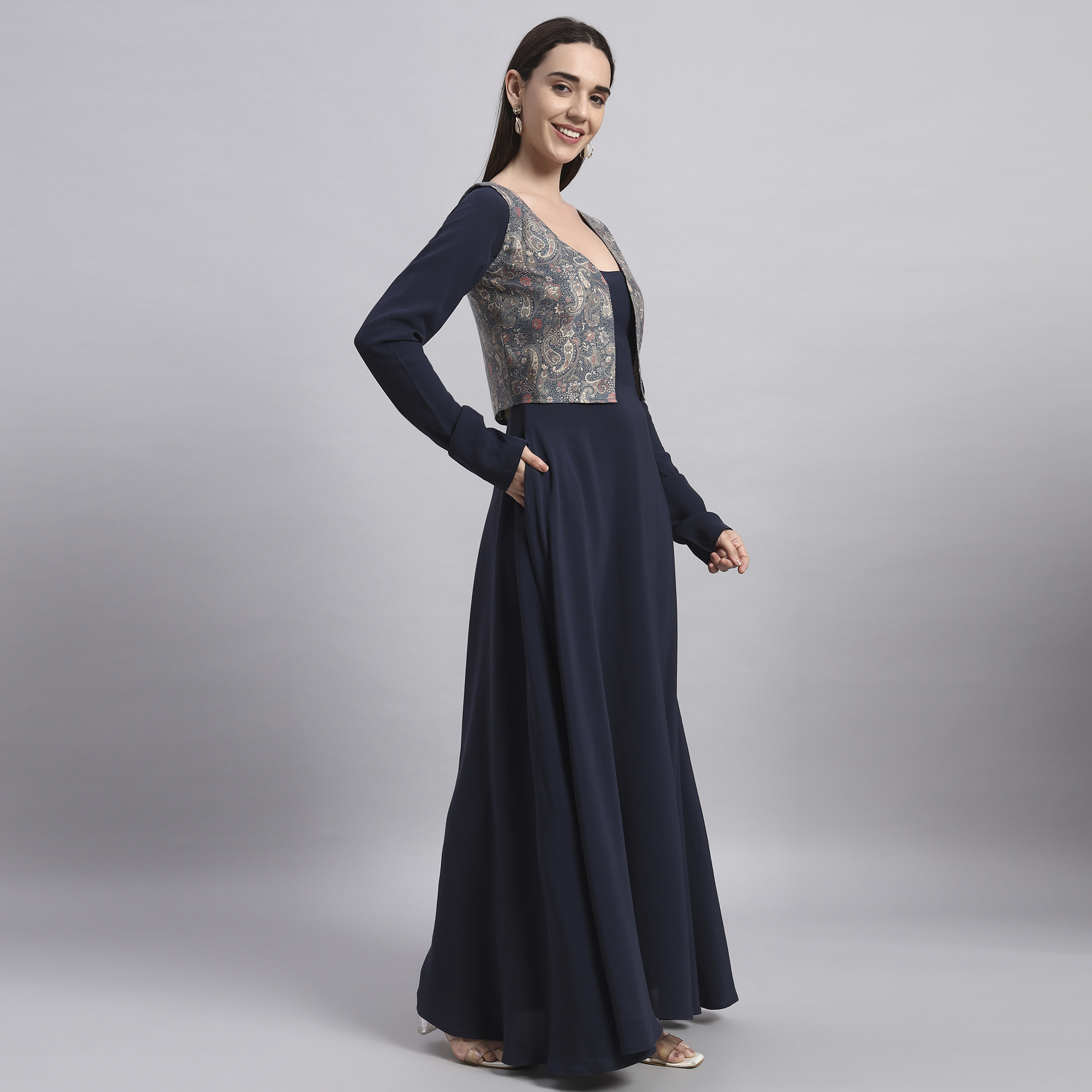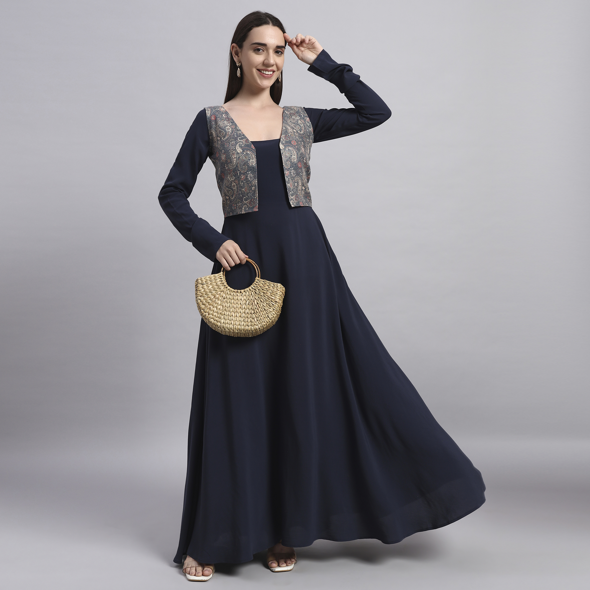 Step into effortless elegance with this navy blue gown and printed jacket set, designed for your festive yet smart gatherings. Crafted from soft viscose georgette, the dress flows beautifully with a flattering flare and convenient side pockets for added comfort. The detachable printed twill jacket adds a subtle Indian touch, making it perfect for weddings, office parties, or western festive events. Style, comfort, and versatility come together in this go-to outfit for days when you want to look chic without trying too hard.