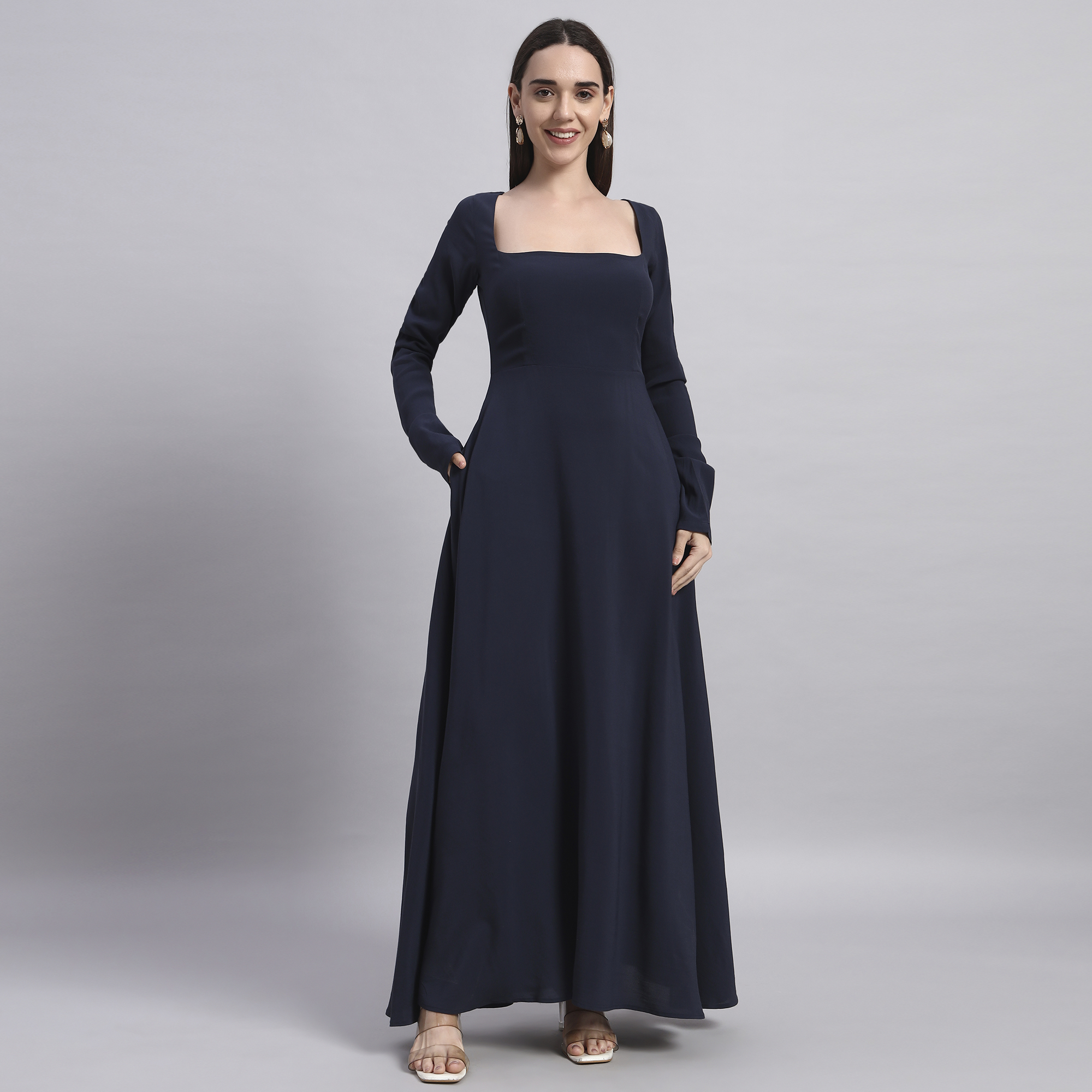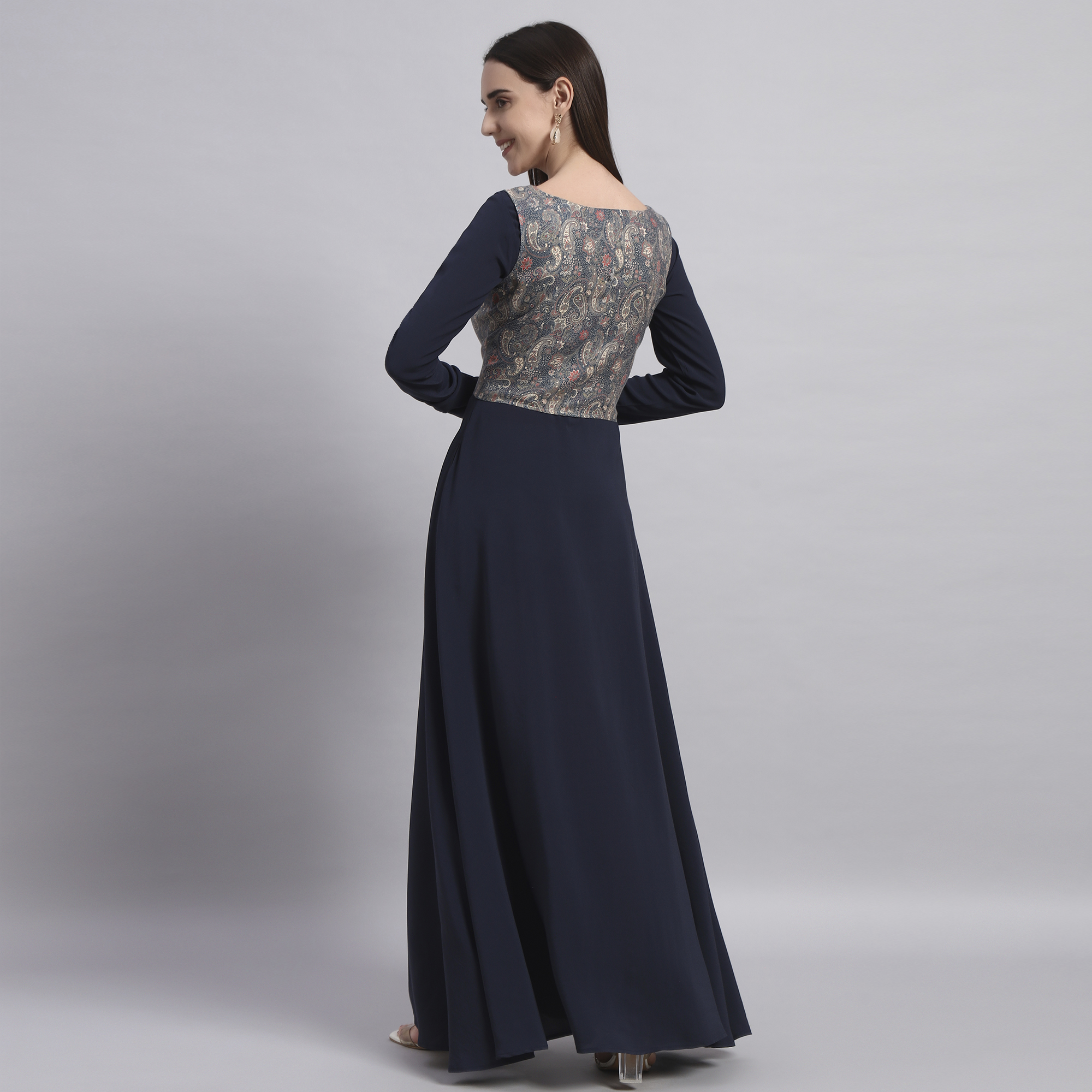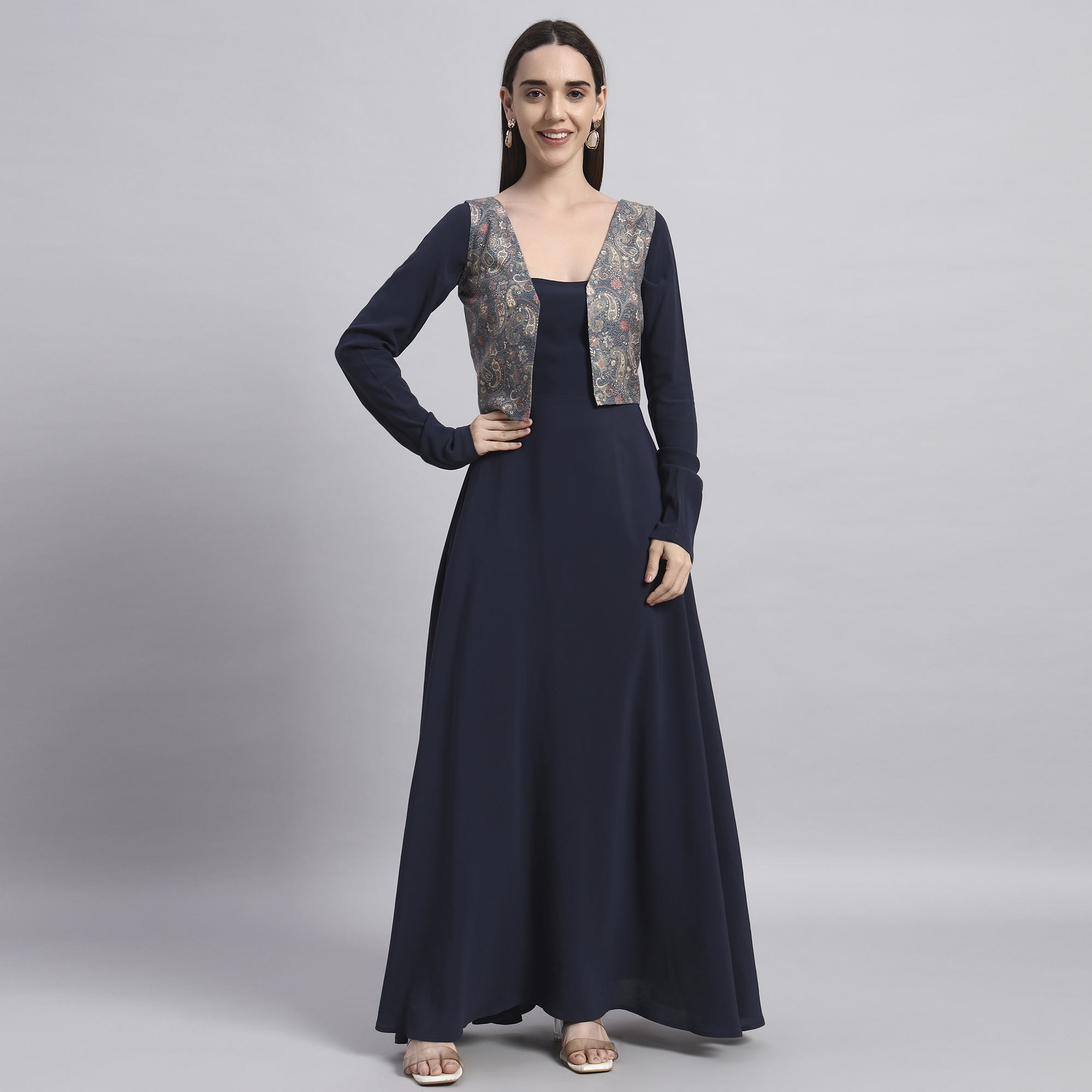 Step into effortless elegance with this navy blue gown and printed jacket set, designed for your festive yet smart gatherings. Crafted from soft viscose georgette, the dress flows beautifully with a flattering flare and convenient side pockets for added comfort. The detachable printed twill jacket adds a subtle Indian touch, making it perfect for weddings, office parties, or western festive events. Style, comfort, and versatility come together in this go-to outfit for days when you want to look chic without trying too hard.
