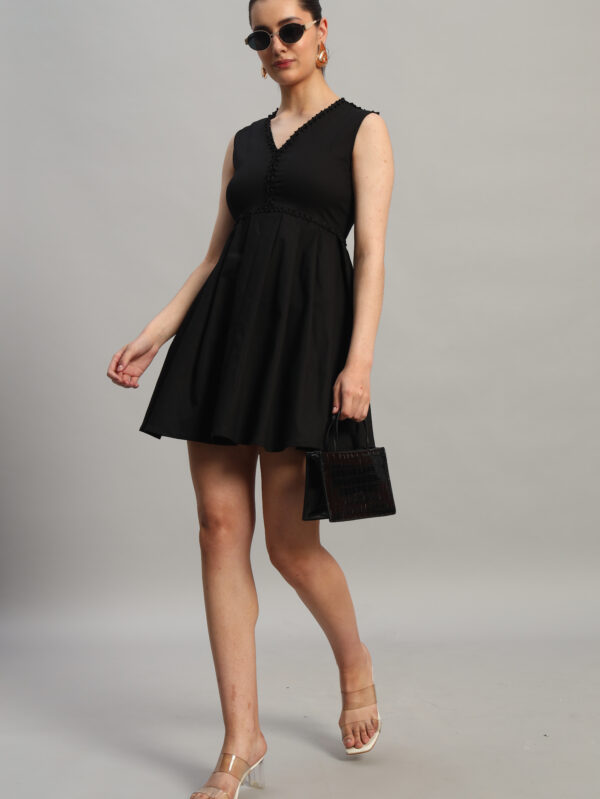 Turn heads with Arty Chic’s Black Sleeveless Dress, a flawless fusion of sophistication and charm. Designed to accentuate your silhouette, this dress features a pleated waistline that creates a flattering fit, while the delicate lace trimadds a touch of feminine grace. The above-knee length lends a playful edge, making it the perfect pick for date nights, parties, and formal occasions.